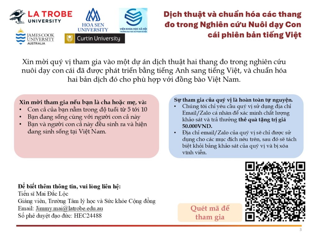 The project aims to translate two measures of parenting scales that have been established in English into Vietnamese, and cross-validate the translations with Vietnamese participants. The measures to be translated include the Coping with Children’s Negative Emotions Scale (CCNES), and the Multidimensional Assessment of Parenting Scale (MAPS).